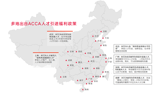 北京、上海、广州、深圳、武汉等众多一二线城市争相出台积分落户、个税减免、专项奖金、置业补贴、子女入学等各项ACCA人才引进福利政策,迈入国内高端稀缺人才行列。